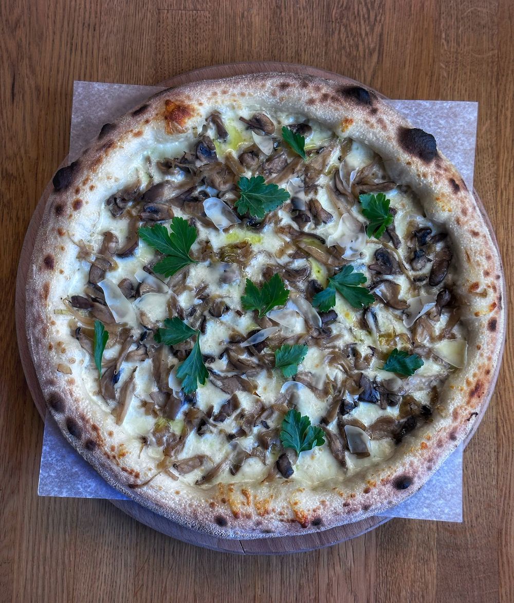 Соус Бешамель, сыр моцарелла, грибы шампиньоны, вешенки, лук, масло трюфельное, лук зелёный